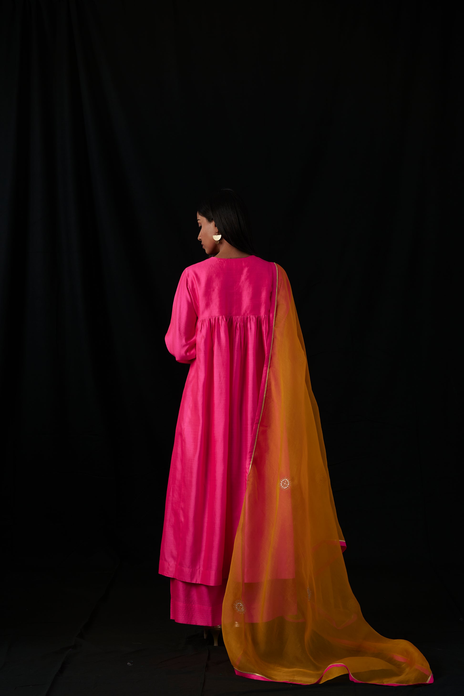 Radiate elegance with the Pink Chand Elegance Set, a luxurious ensemble crafted from pure silk. The kurta features a classic V-neck design with delicate hand embroidery of moon-inspired motifs on the front yoke. The pants provide a perfect fit with their back elastic waistband and intricate hem detailing. The ensemble is complemented by a contrast-colored dupatta adorned with strategically placed embroidered motifs, enhancing the set’s overall charm.